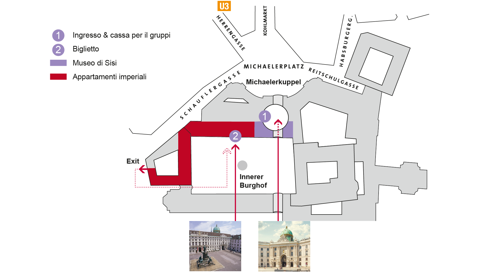 L'ingresso per tutti i visitatori in possesso di un biglietto valido si trova proprio sotto la cupola Michaelerkuppel, quando si attraversa la porta Michaeltor. La biglietteria per i visitatori individuali si trova a sinistra della Kaisertor, nel cortile interno del palazzo. La biglietteria per i gruppi si trova nell'atrio d'ingresso, sotto la Michaelerkuppel.